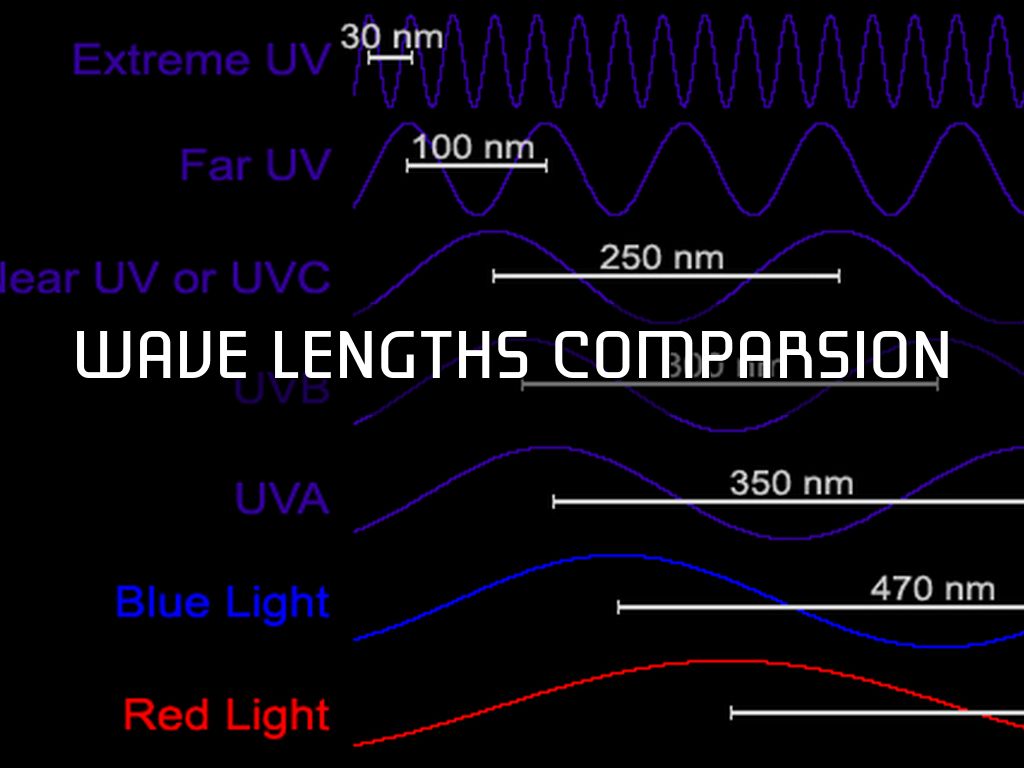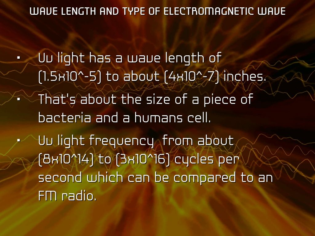 Uv light has a wave length of (1.5x10^-5) to about (4x10^-7) inches.