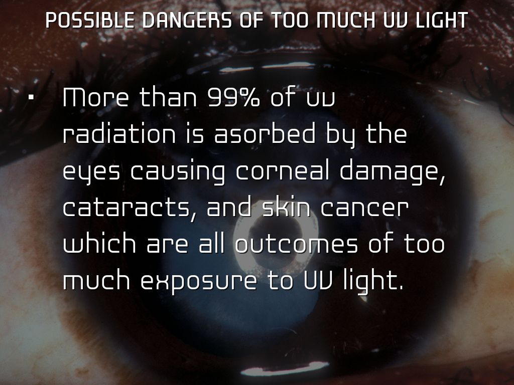 More than 99% of uv radiation is asorbed by the eyes causing corneal damage, cataracts, and skin cancer which are all outcomes of too much exposure to UV light.