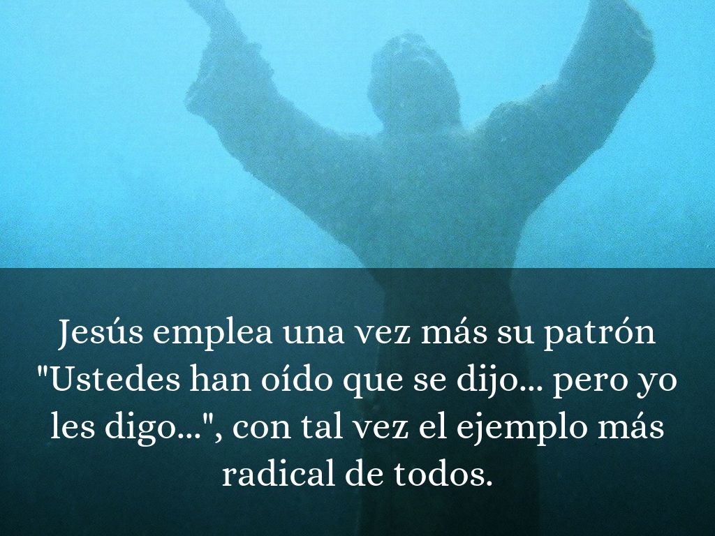 Jesús emplea una vez más su patrón "Ustedes han oído que se dijo... pero yo les digo...", con tal vez el ejemplo más radical de todos.