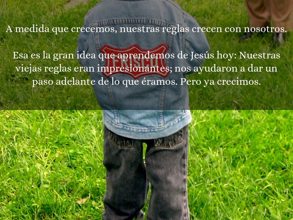 Esa es la gran idea que aprendemos de Jesús hoy: Nuestras viejas reglas eran impresionantes; nos ayudaron a dar un paso adelante de lo que éramos. Pero ya crecimos.