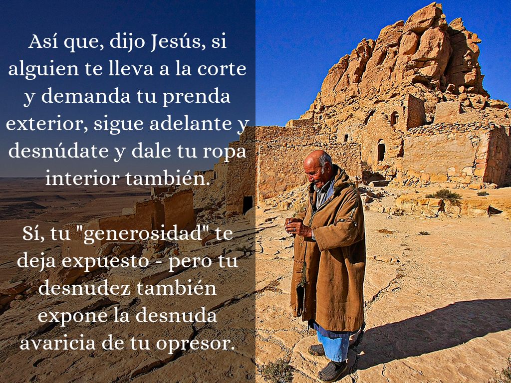 Así que, dijo Jesús, si alguien te lleva a la corte y demanda tu prenda exterior, sigue adelante y desnúdate y dale tu ropa interior también.