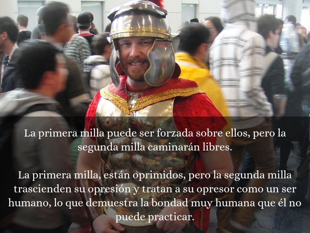 La primera milla, están oprimidos, pero la segunda milla trascienden su opresión y tratan a su opresor como un ser humano, lo que demuestra la bondad muy humana que él no puede practicar.