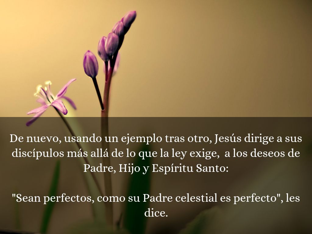 De nuevo, usando un ejemplo tras otro, Jesús dirige a sus discípulos más allá de lo que la ley exige, a los deseos de Padre, Hijo y Espíritu Santo: