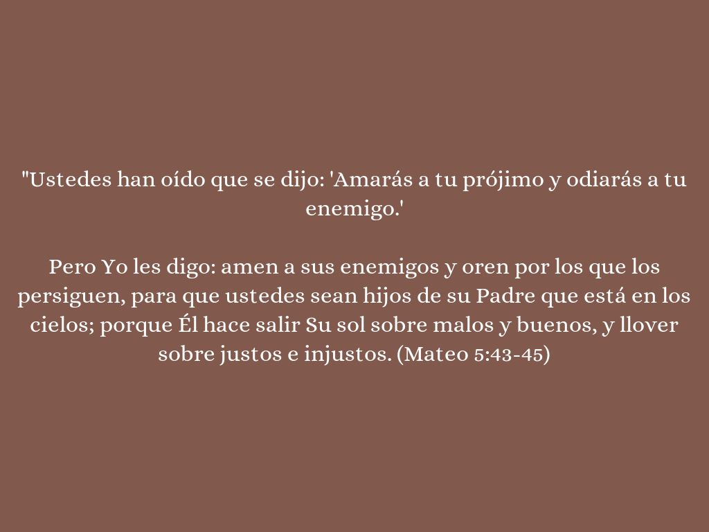 Pero Yo les digo: amen a sus enemigos y oren por los que los persiguen, para que ustedes sean hijos de su Padre que está en los cielos; porque Él hace salir Su sol sobre malos y buenos, y llover sobre justos e injustos. (Mateo 5:43-45)
