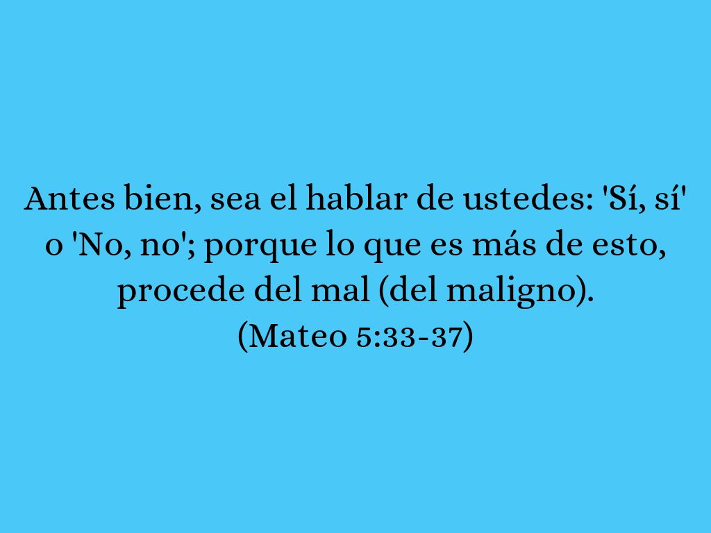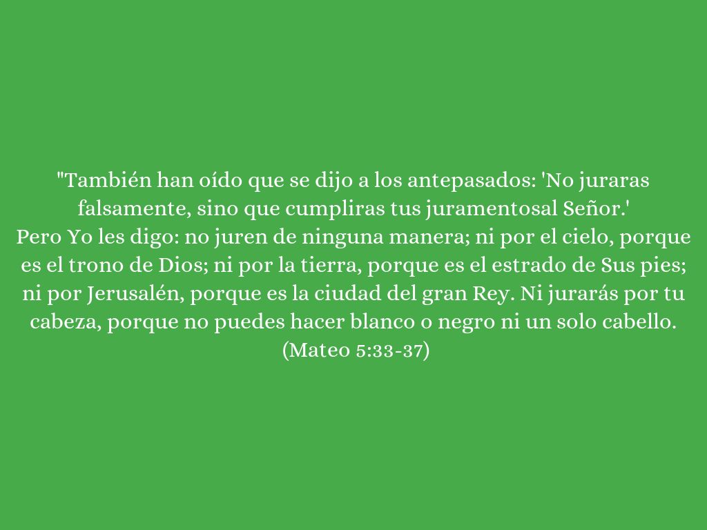 Pero Yo les digo: no juren de ninguna manera; ni por el cielo, porque es el trono de Dios; ni por la tierra, porque es el estrado de Sus pies; ni por Jerusalén, porque es la ciudad del gran Rey. Ni jurarás por tu cabeza, porque no puedes hacer blanco o negro ni un solo cabello. (Mateo 5:33-37)