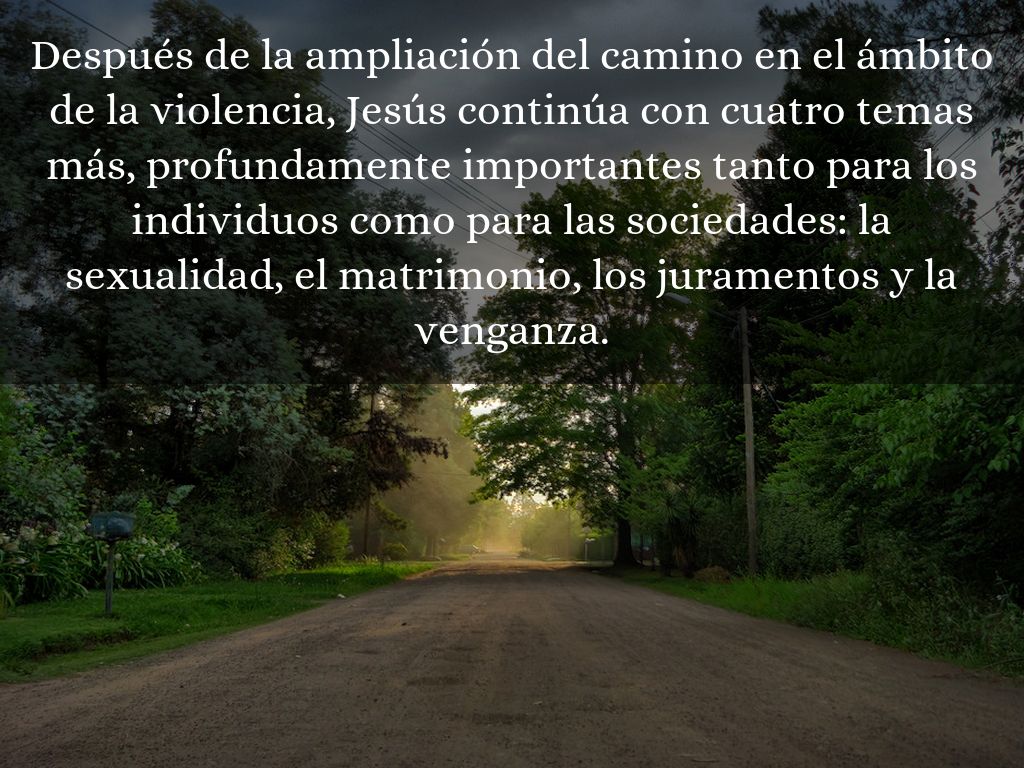 Después de la ampliación del camino en el ámbito de la violencia, Jesús continúa con cuatro temas más, profundamente importantes tanto para los individuos como para las sociedades: la sexualidad, el matrimonio, los juramentos y la venganza.