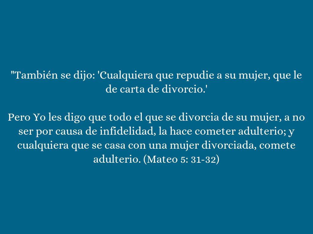 Pero Yo les digo que todo el que se divorcia de su mujer, a no ser por causa de infidelidad, la hace cometer adulterio; y cualquiera que se casa con una mujer divorciada, comete adulterio. (Mateo 5: 31-32)