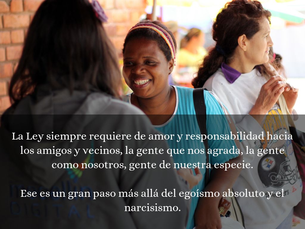 La Ley siempre requiere de amor y responsabilidad hacia los amigos y vecinos, la gente que nos agrada, la gente como nosotros, gente de nuestra especie.