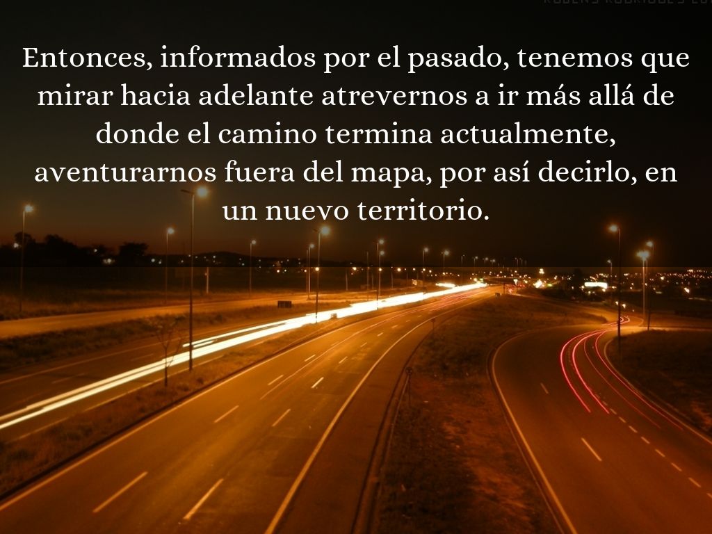 Entonces, informados por el pasado, tenemos que mirar hacia adelante atrevernos a ir más allá de donde el camino termina actualmente, aventurarnos fuera del mapa, por así decirlo, en un nuevo territorio.