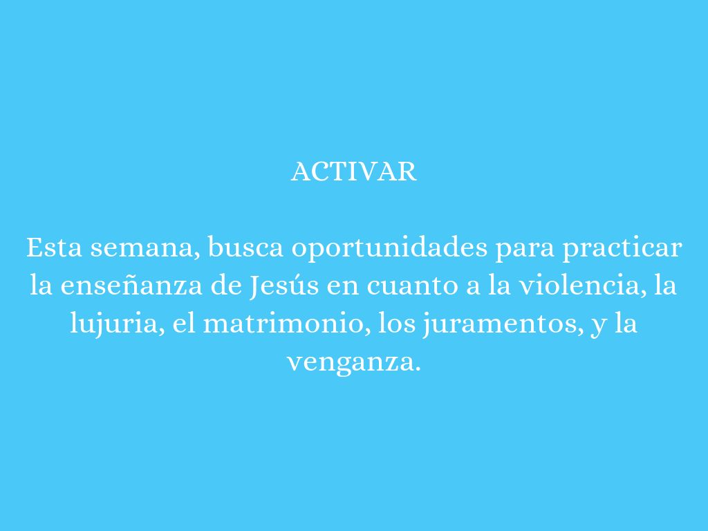 Esta semana, busca oportunidades para practicar la enseñanza de Jesús en cuanto a la violencia, la lujuria, el matrimonio, los juramentos, y la venganza.