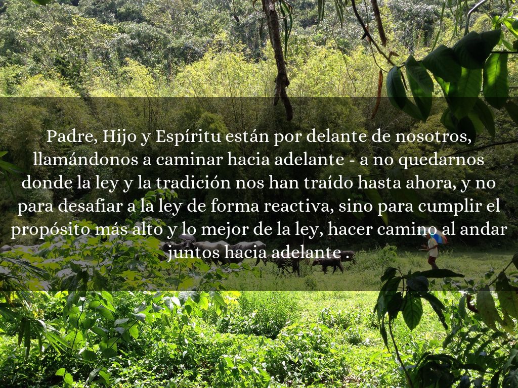 Padre, Hijo y Espíritu están por delante de nosotros, llamándonos a caminar hacia adelante - a no quedarnos donde la ley y la tradición nos han traído hasta ahora, y no para desafiar a la ley de forma reactiva, sino para cumplir el propósito más alto y lo mejor de la ley, hacer camino al andar juntos hacia adelante .