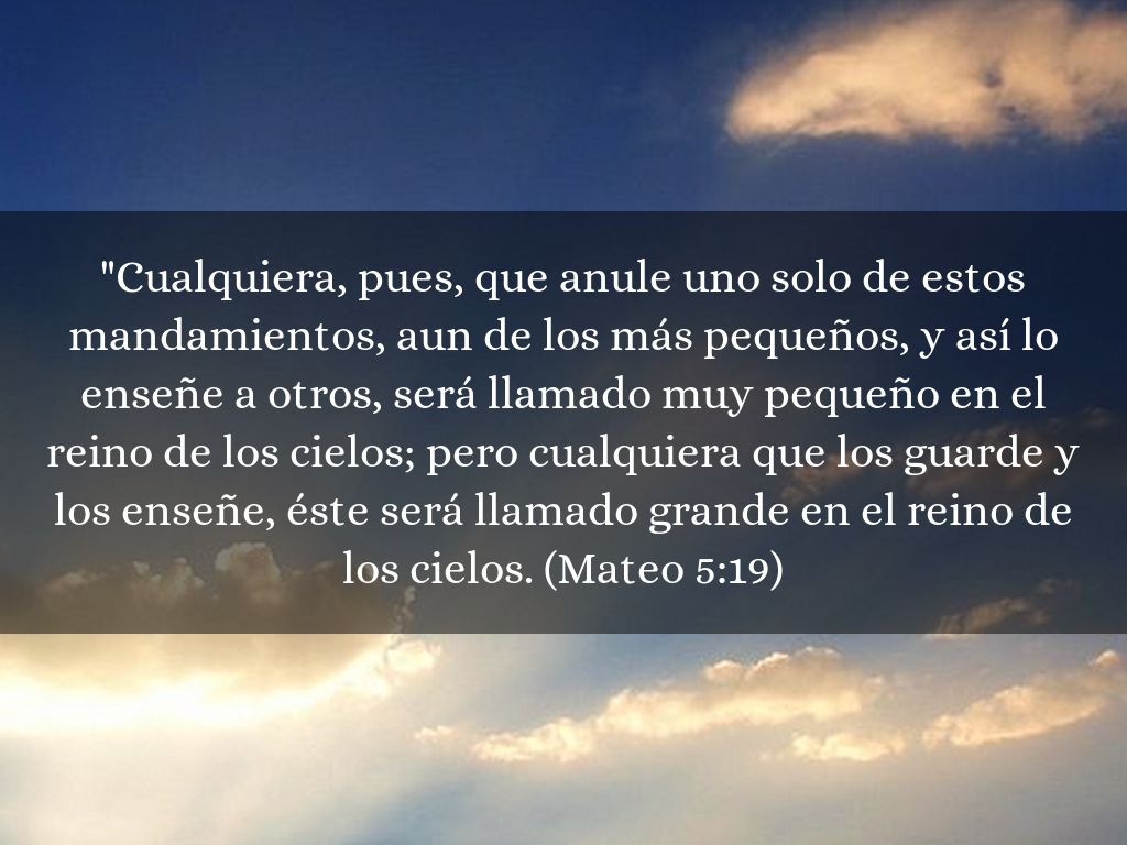 "Cualquiera, pues, que anule uno solo de estos mandamientos, aun de los más pequeños, y así lo enseñe a otros, será llamado muy pequeño en el reino de los cielos; pero cualquiera que los guarde y los enseñe, éste será llamado grande en el reino de los cielos. (Mateo 5:19)