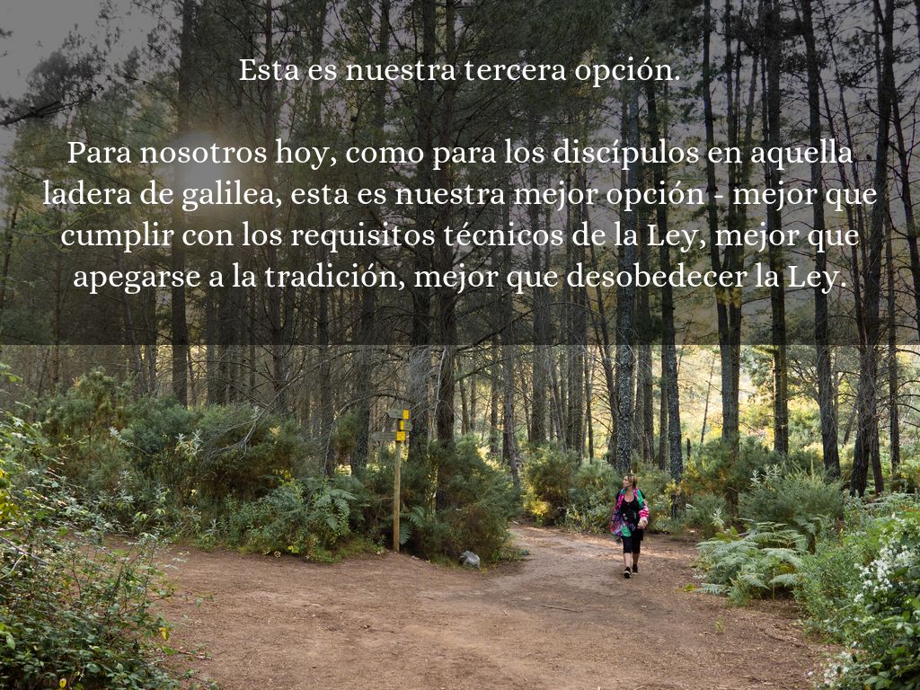 Para nosotros hoy, como para los discípulos en aquella ladera de galilea, esta es nuestra mejor opción - mejor que cumplir con los requisitos técnicos de la Ley, mejor que apegarse a la tradición, mejor que desobedecer la Ley.