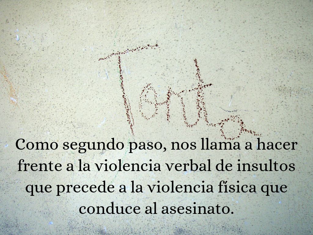 Como segundo paso, nos llama a hacer frente a la violencia verbal de insultos que precede a la violencia física que conduce al asesinato.