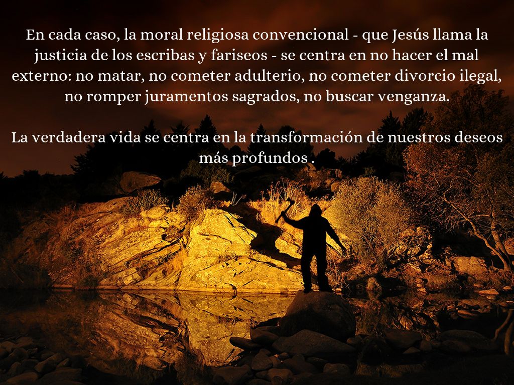 En cada caso, la moral religiosa convencional - que Jesús llama la justicia de los escribas y fariseos - se centra en no hacer el mal externo: no matar, no cometer adulterio, no cometer divorcio ilegal, no romper juramentos sagrados, no buscar venganza.