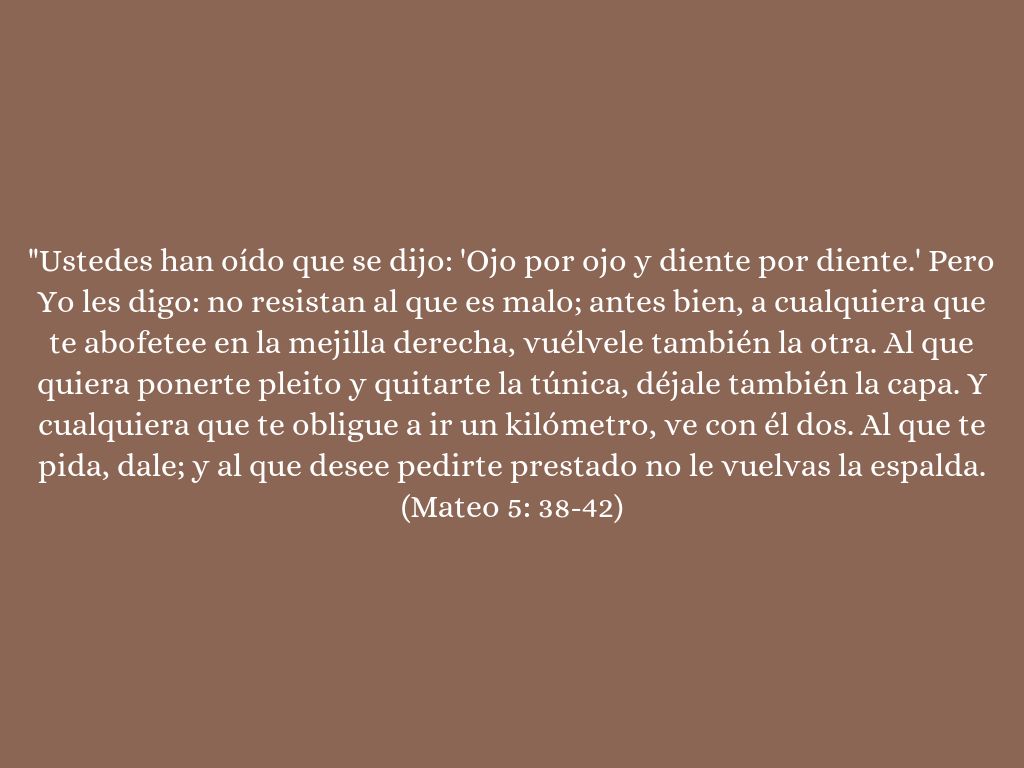 "Ustedes han oído que se dijo: 'Ojo por ojo y diente por diente.' Pero Yo les digo: no resistan al que es malo; antes bien, a cualquiera que te abofetee en la mejilla derecha, vuélvele también la otra. Al que quiera ponerte pleito y quitarte la túnica, déjale también la capa. Y cualquiera que te obligue a ir un kilómetro, ve con él dos. Al que te pida, dale; y al que desee pedirte prestado no le vuelvas la espalda. (Mateo 5: 38-42)