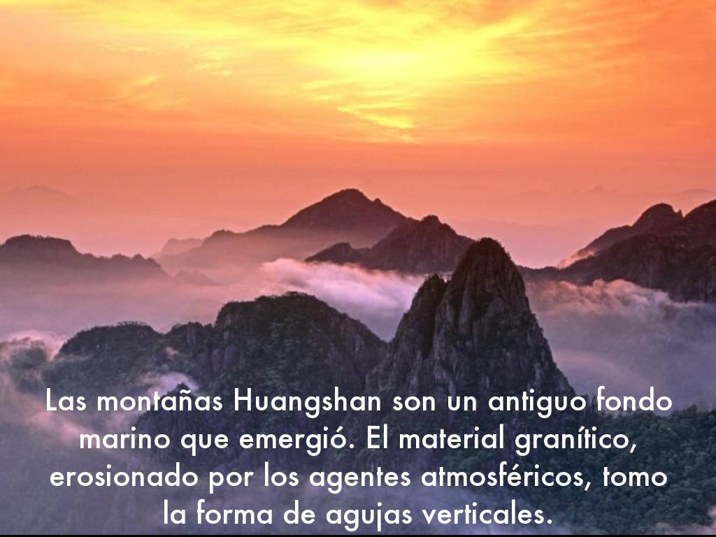 Las montañas Huangshan son un antiguo fondo marino que emergió. El material granítico, erosionado por los agentes atmosféricos, tomo la forma de agujas verticales.