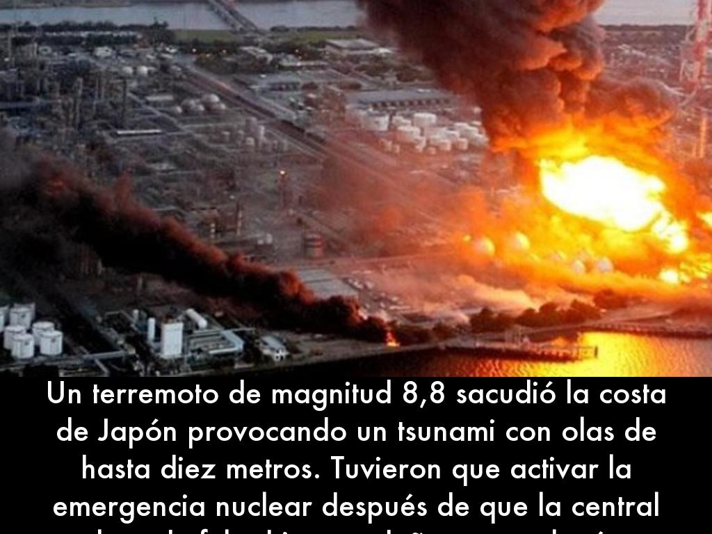 Un terremoto de magnitud 8,8 sacudió la costa de Japón provocando un tsunami con olas de hasta diez metros. Tuvieron que activar la emergencia nuclear después de que la central nuclear de fukushima se dañase por el seísmo.