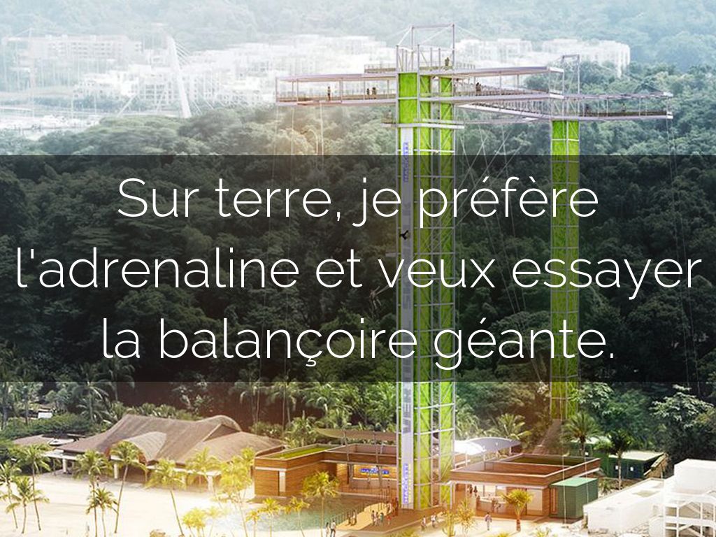 Sur terre, je préfère l'adrenaline et veux essayer la balançoire géante.
