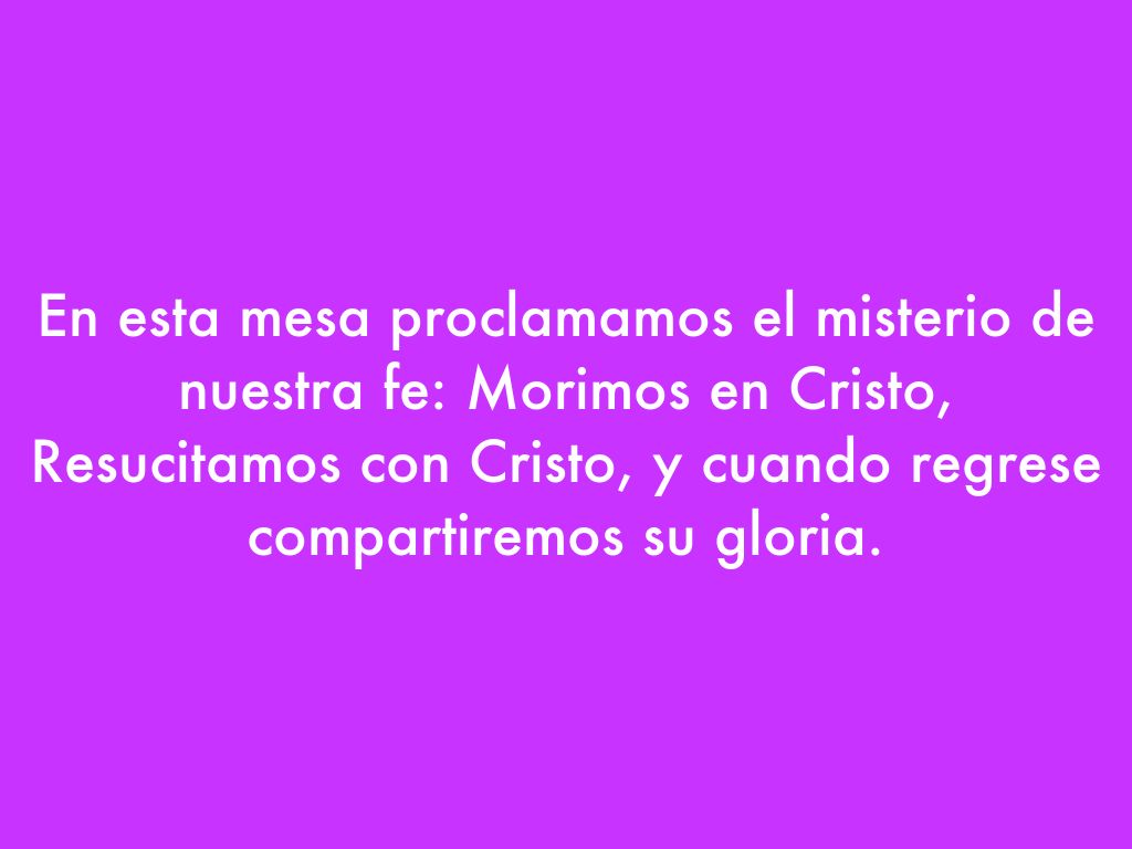 En esta mesa proclamamos el misterio de nuestra fe: Morimos en Cristo, Resucitamos con Cristo, y cuando regrese compartiremos su gloria.
