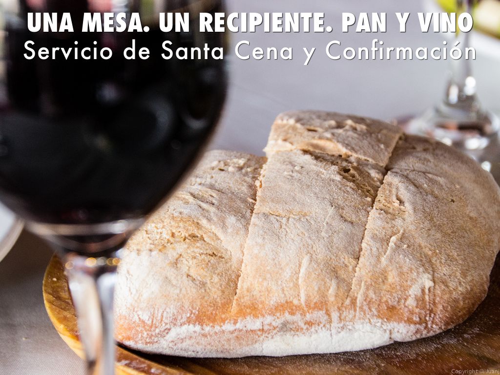UNA MESA. UN RECIPIENTE. PAN Y VINO
