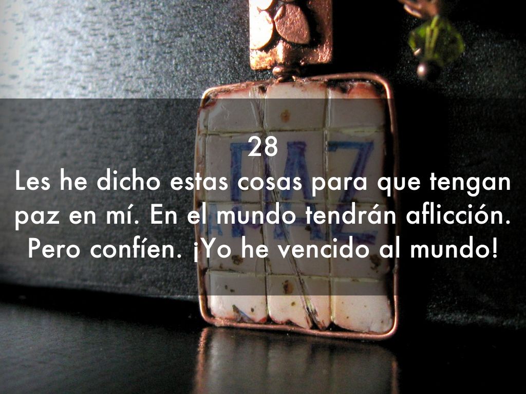 Les he dicho estas cosas para que tengan paz en mí. En el mundo tendrán aflicción. Pero confíen. ¡Yo he vencido al mundo!