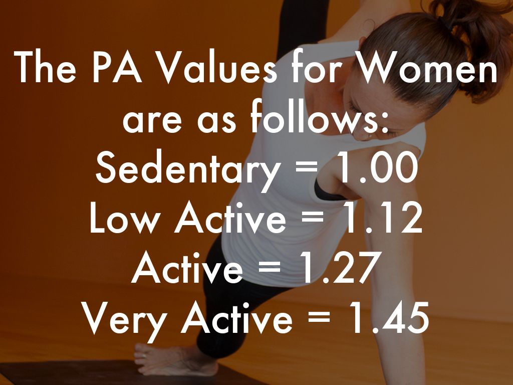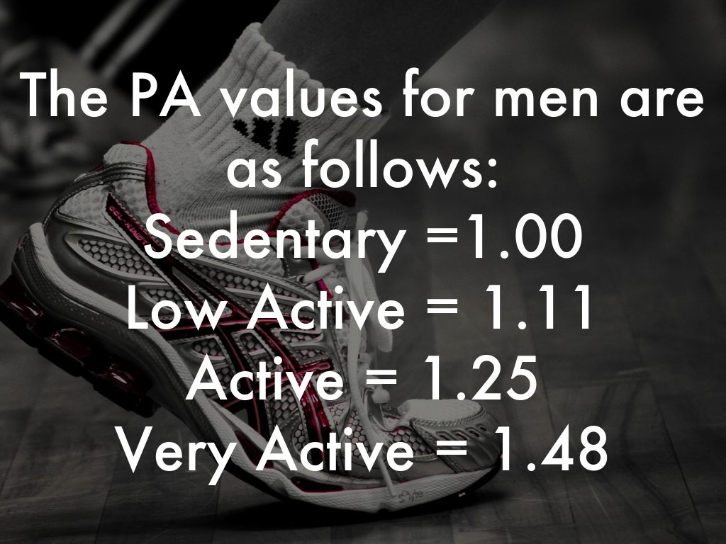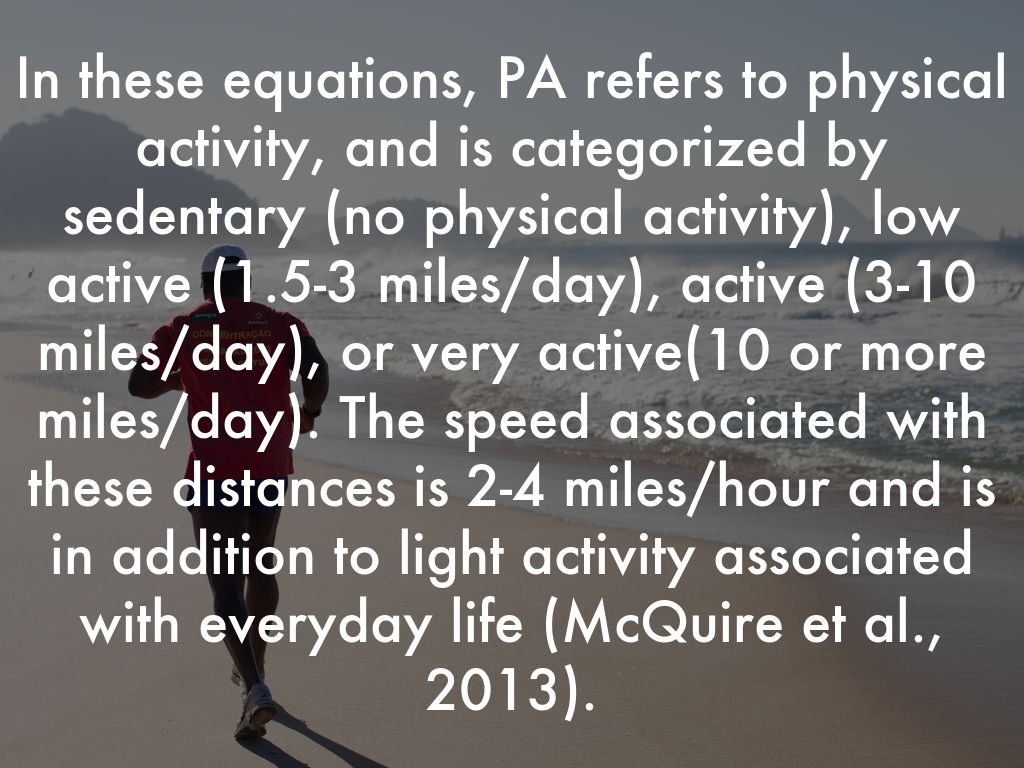 In these equations, PA refers to physical activity, and is categorized by sedentary (no physical activity), low active (1.5-3 miles/day), active (3-10 miles/day), or very active(10 or more miles/day). The speed associated with these distances is 2-4 miles/hour and is in addition to light activity associated with everyday life (McQuire et al., 2013).