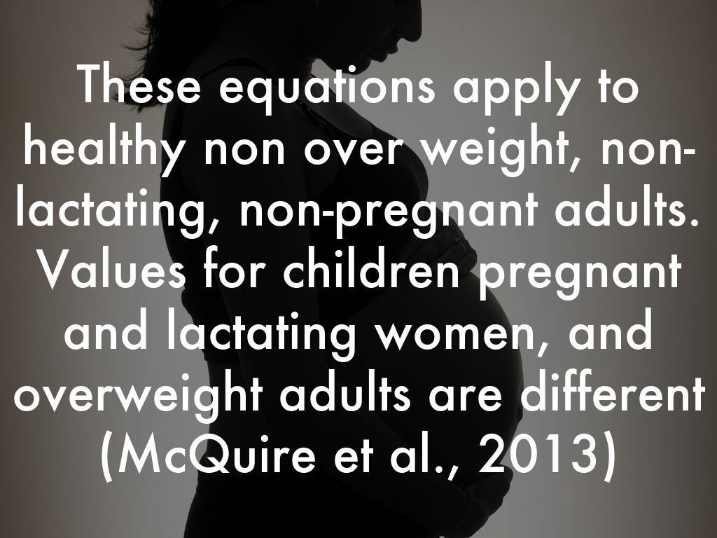 These equations apply to healthy non over weight, non-lactating, non-pregnant adults. Values for children pregnant and lactating women, and overweight adults are different (McQuire et al., 2013)