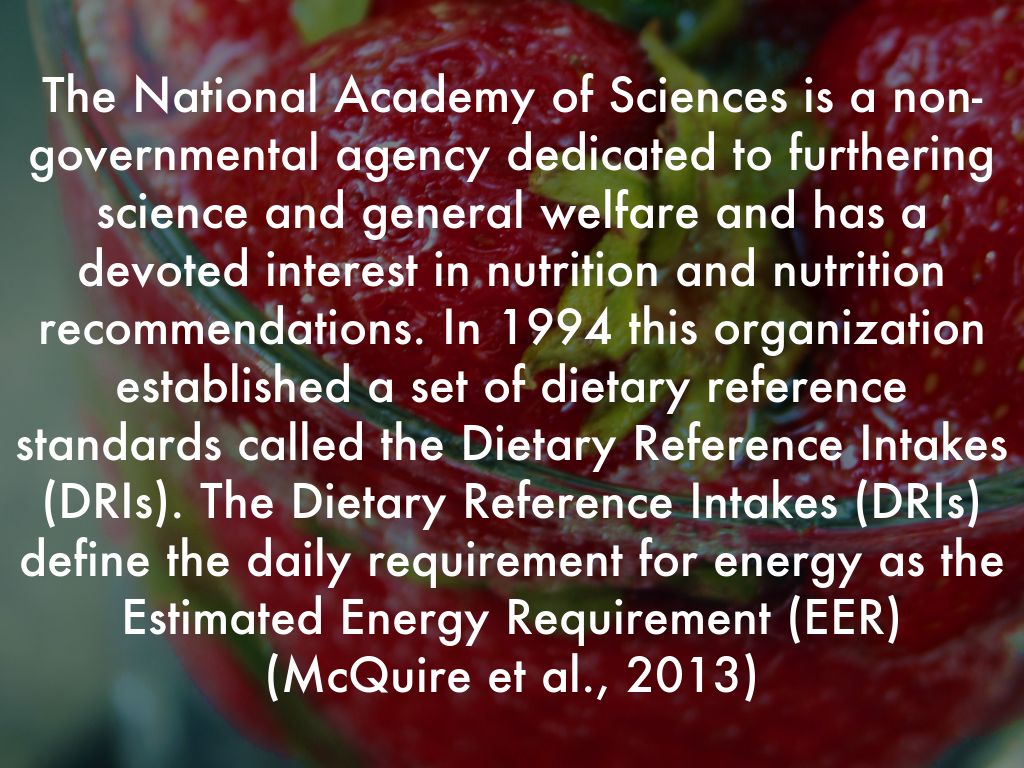 The National Academy of Sciences is a non-governmental agency dedicated to furthering science and general welfare and has a devoted interest in nutrition and nutrition recommendations. In 1994 this organization established a set of dietary reference standards called the Dietary Reference Intakes (DRIs). The Dietary Reference Intakes (DRIs) define the daily requirement for energy as the Estimated Energy Requirement (EER) (McQuire et al., 2013)