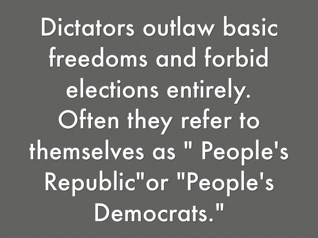 Dictators outlaw basic freedoms and forbid elections entirely.