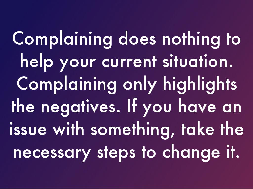 Complaining does nothing to help your current situation. Complaining only highlights the negatives. If you have an issue with something, take the necessary steps to change it.