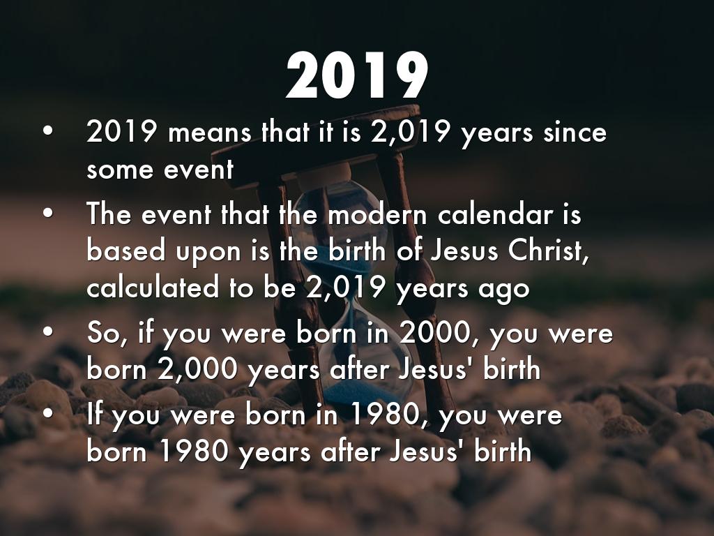 The event that the modern calendar is based upon is the birth of Jesus Christ, calculated to be 2,019 years ago