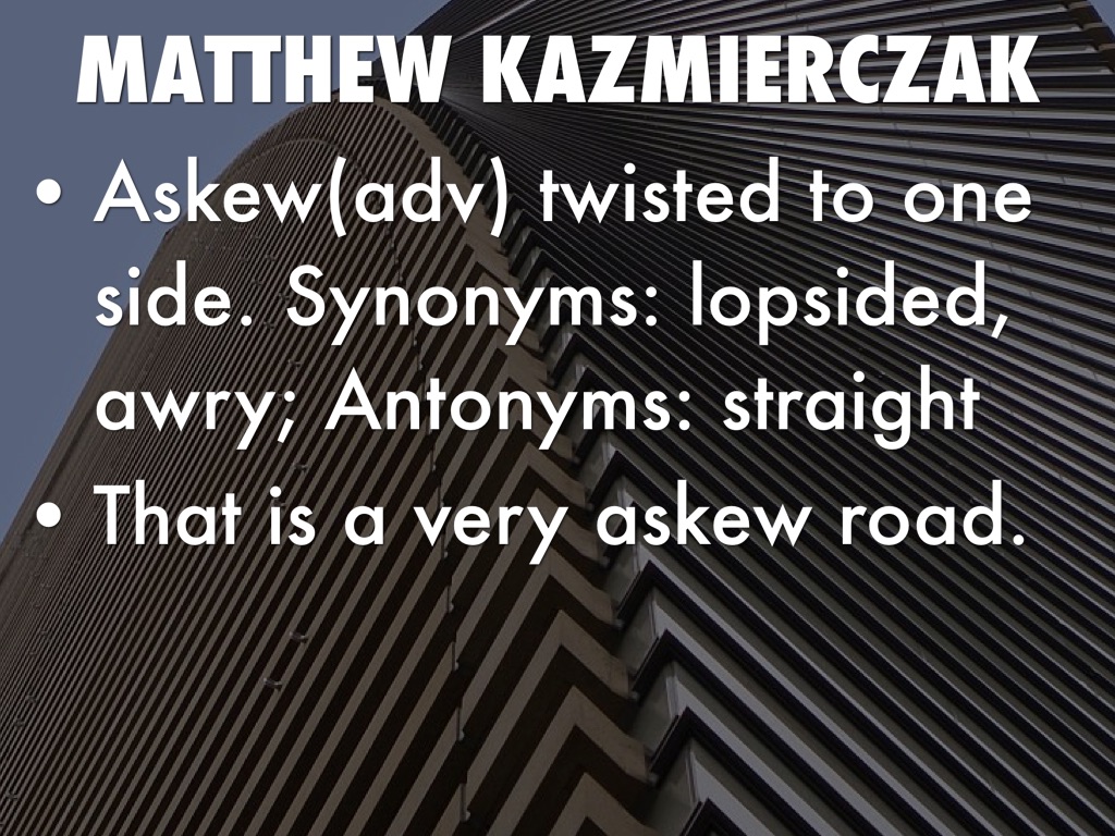 Askew(adv) twisted to one side. Synonyms: lopsided, awry; Antonyms: straight