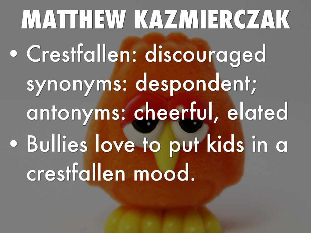 Crestfallen: discouraged synonyms: despondent; antonyms: cheerful, elated