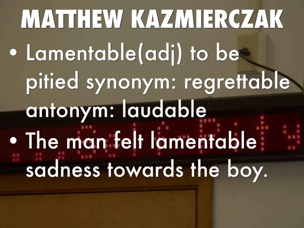 Lamentable(adj) to be pitied synonym: regrettable antonym: laudable