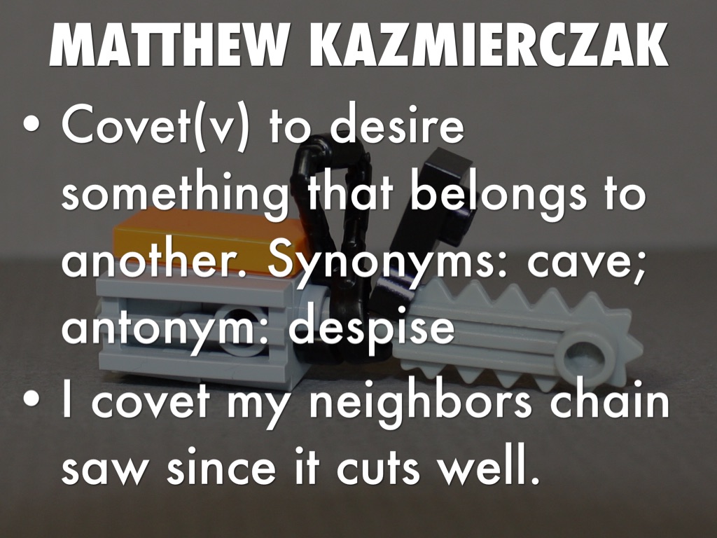 Covet(v) to desire something that belongs to another. Synonyms: cave; antonym: despise