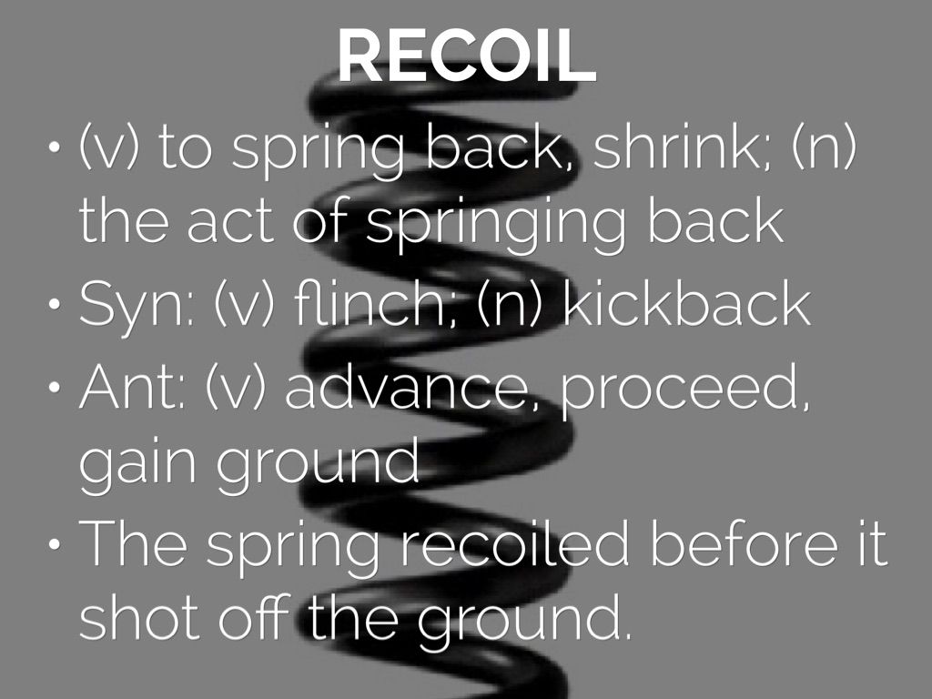 (v) to spring back, shrink; (n) the act of springing back