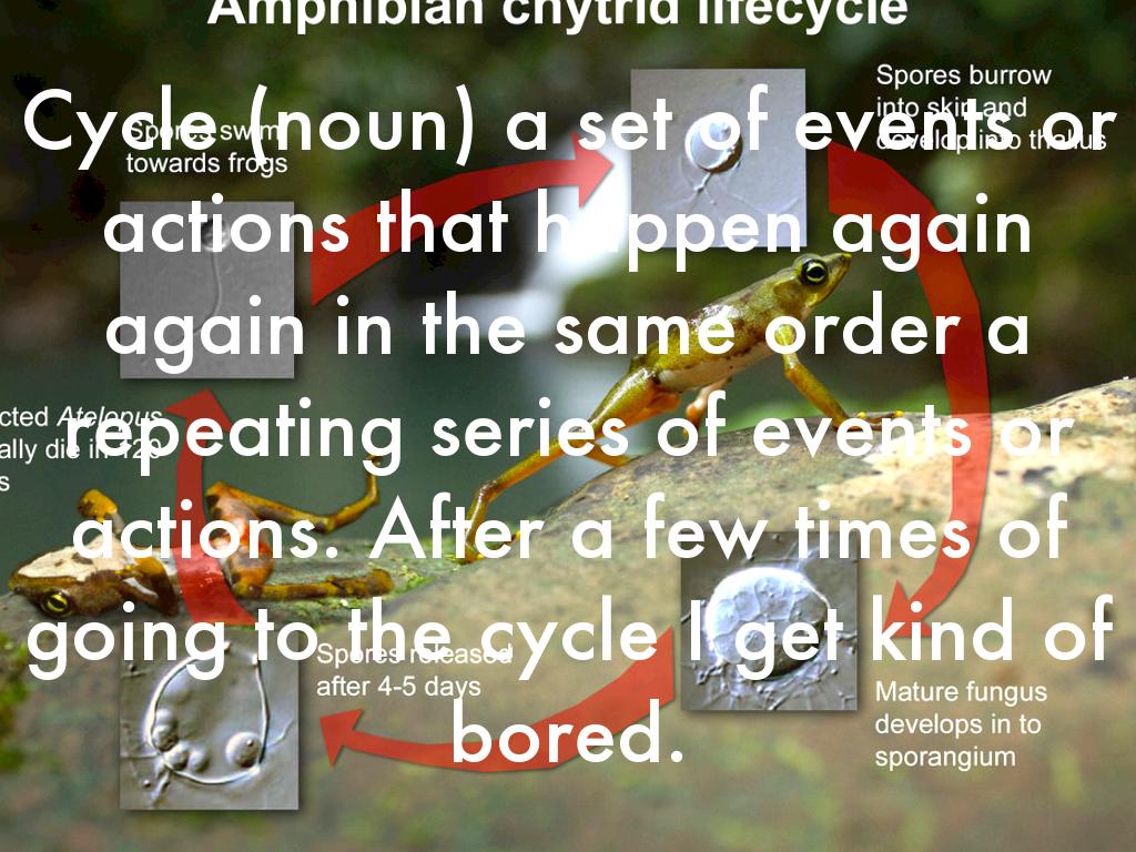 Cycle (noun) a set of events or actions that happen again again in the same order a repeating series of events or actions. After a few times of going to the cycle I get kind of bored.
