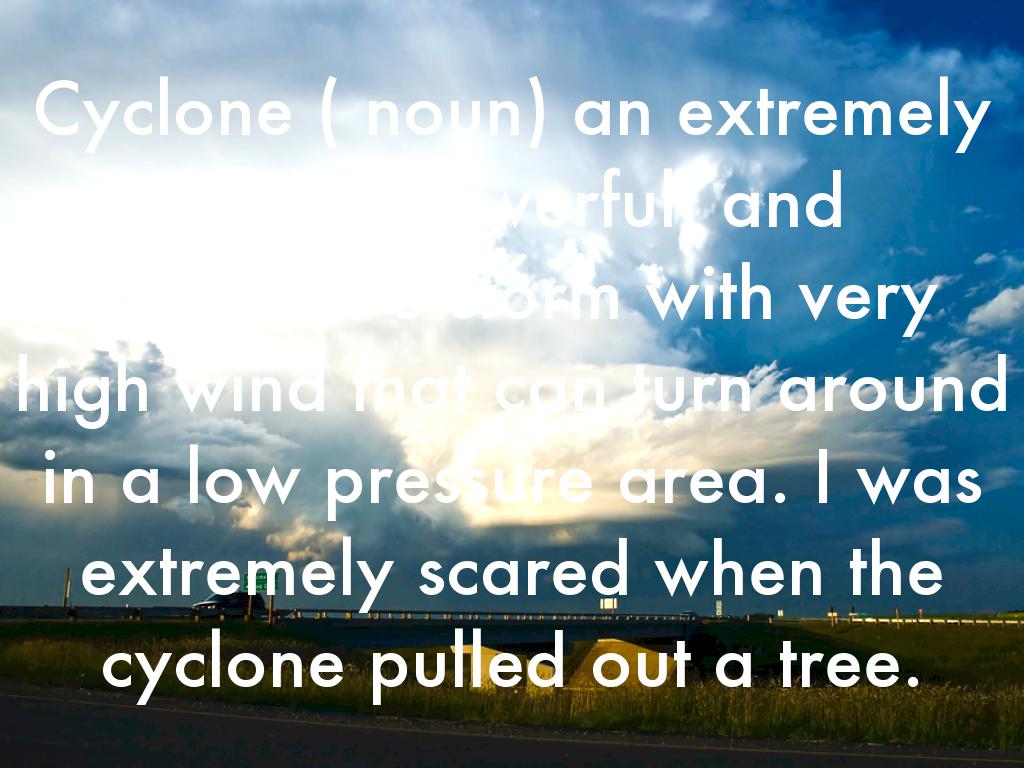 Cyclone ( noun) an extremely large, powerful, and destructive storm with very high wind that can turn around in a low pressure area. I was extremely scared when the cyclone pulled out a tree.