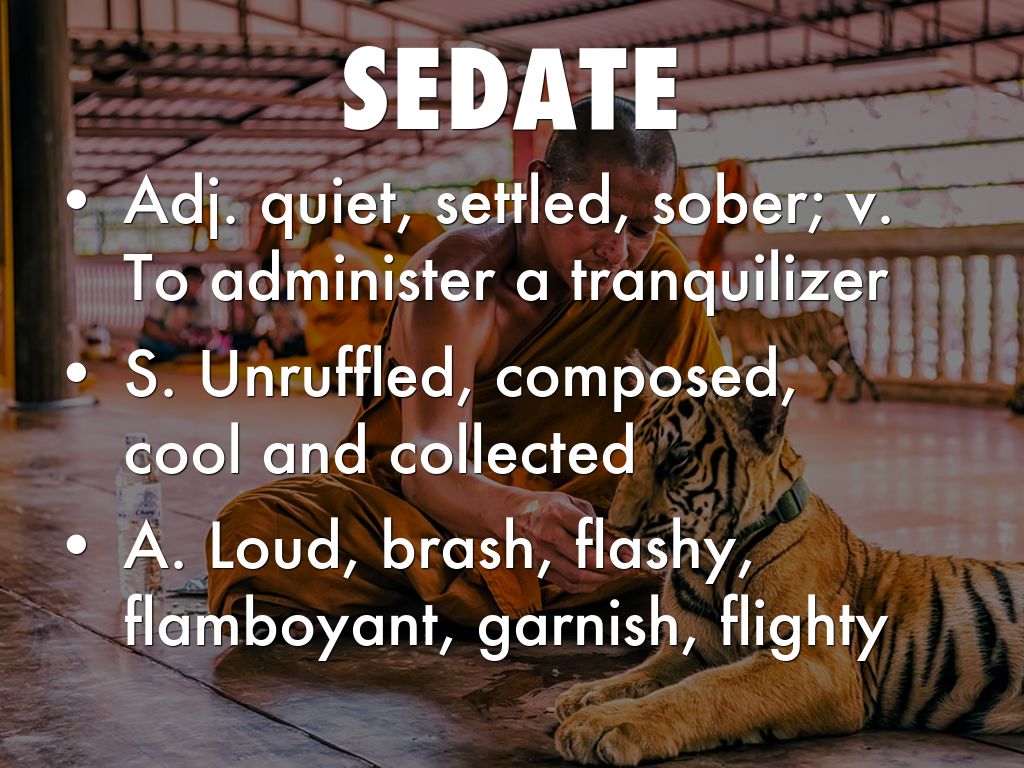 • Adj. quiet, settled, sober; v. To administer a tranquilizer