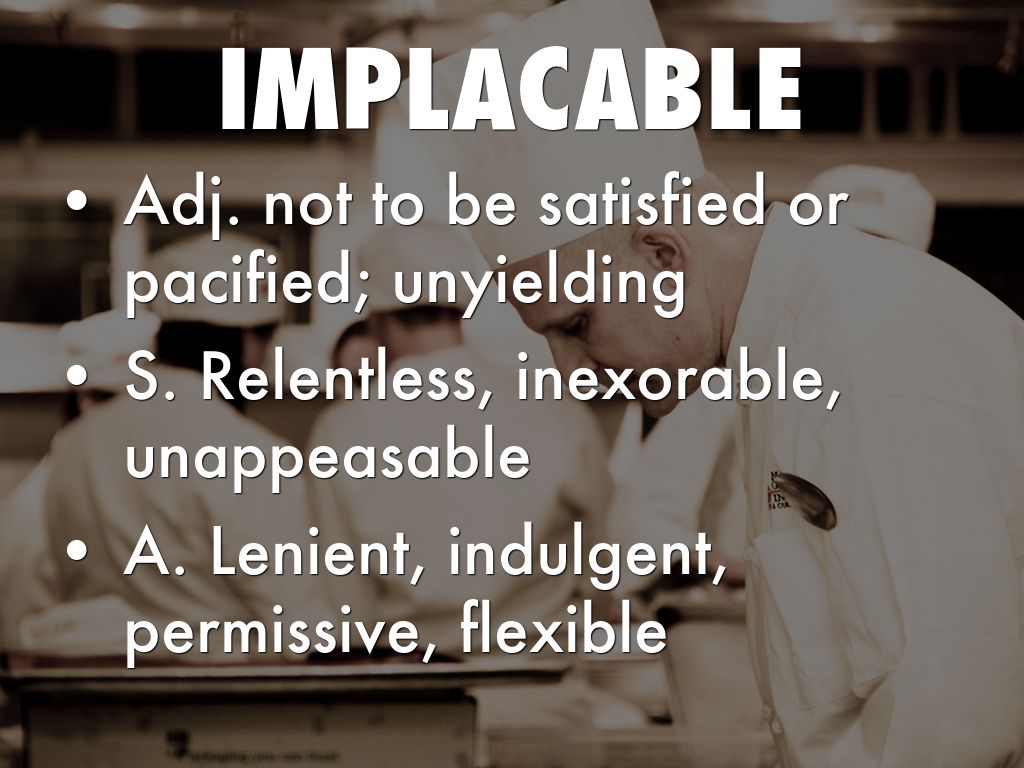 • S. Relentless, inexorable, unappeasable