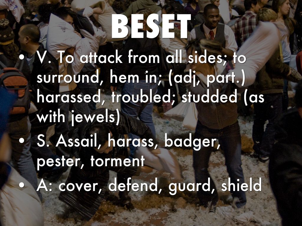 • V. To attack from all sides; to surround, hem in; (adj, part.) harassed, troubled; studded (as with jewels)
