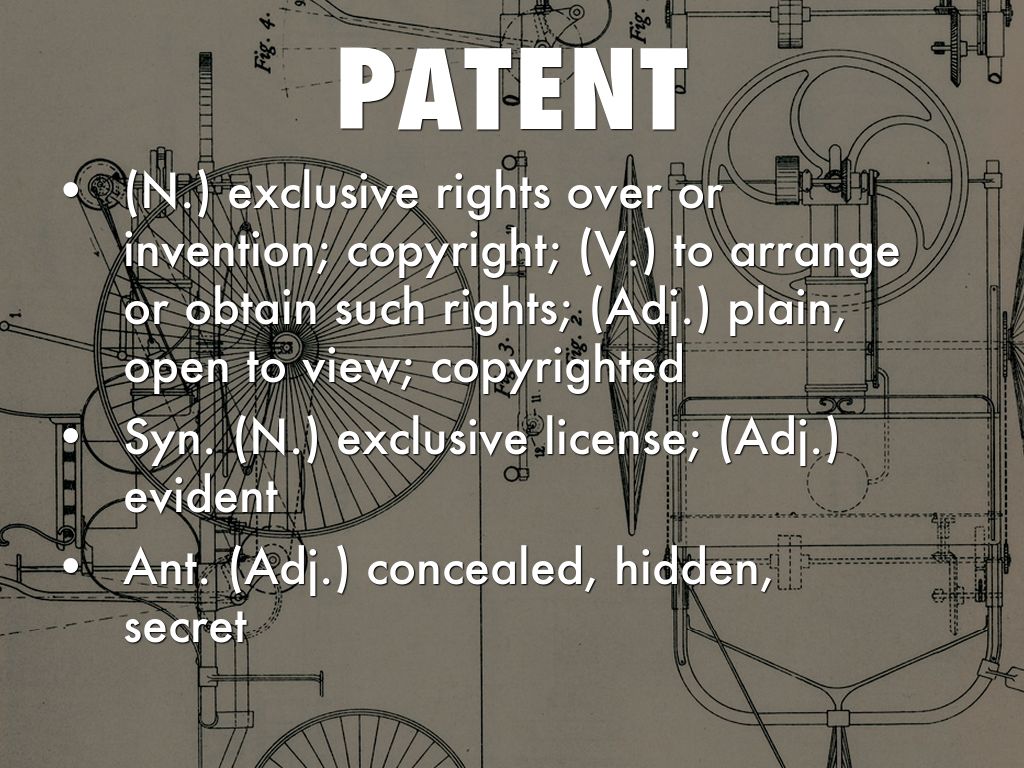 (N.) exclusive rights over or invention; copyright; (V.) to arrange or obtain such rights; (Adj.) plain, open to view; copyrighted