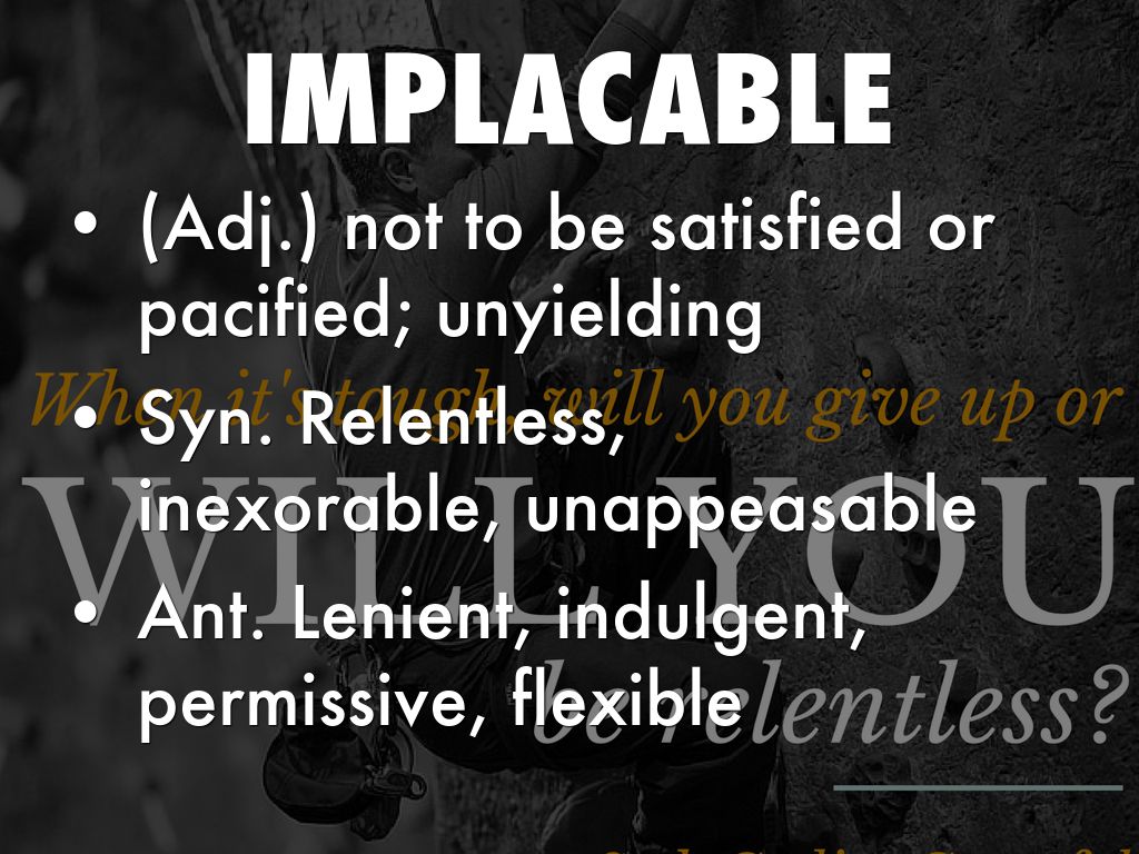 Syn. Relentless, inexorable, unappeasable