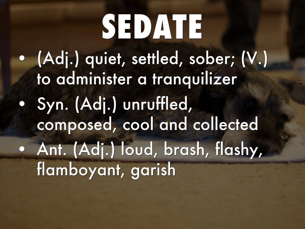 (Adj.) quiet, settled, sober; (V.) to administer a tranquilizer