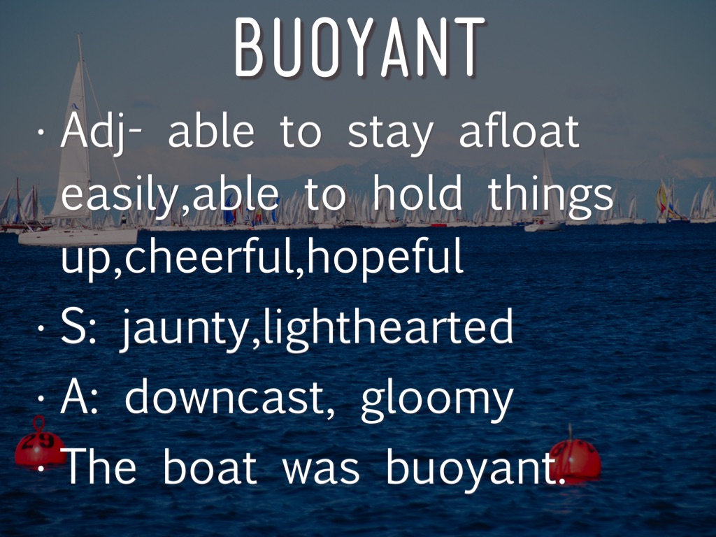Adj- able to stay afloat easily,able to hold things up,cheerful,hopeful