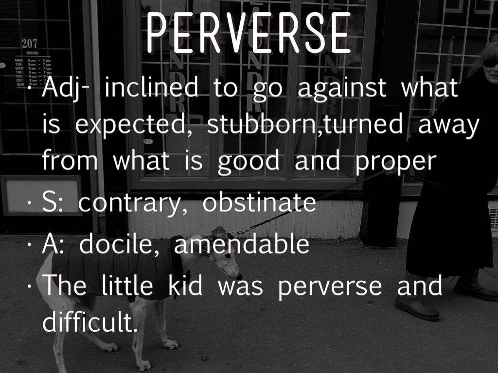 Adj- inclined to go against what is expected, stubborn,turned away from what is good and proper