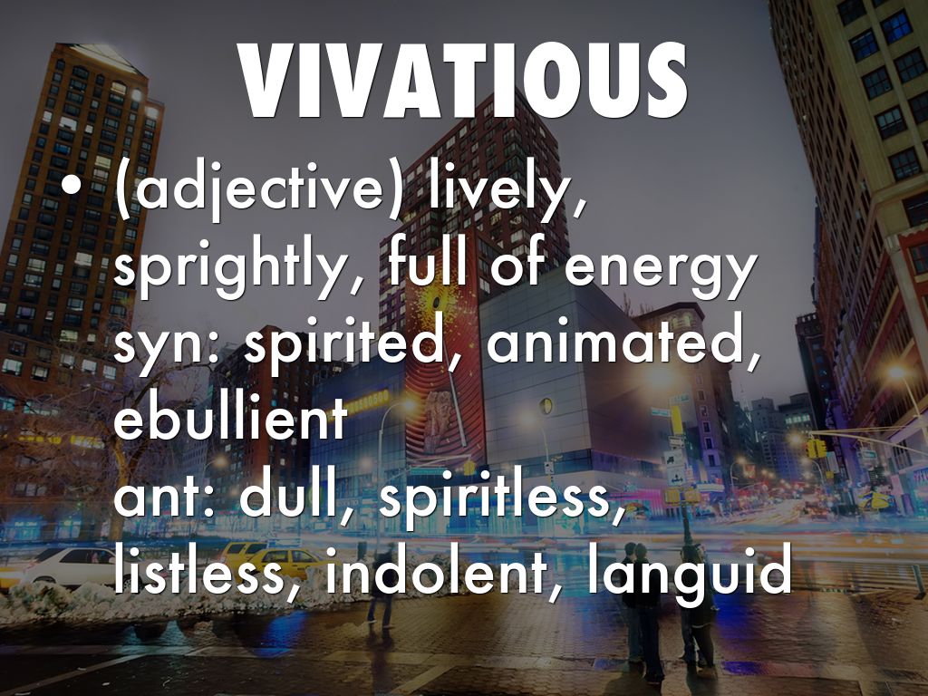 (adjective) lively, sprightly, full of energy syn: spirited, animated, ebullient ant: dull, spiritless, listless, indolent, languid