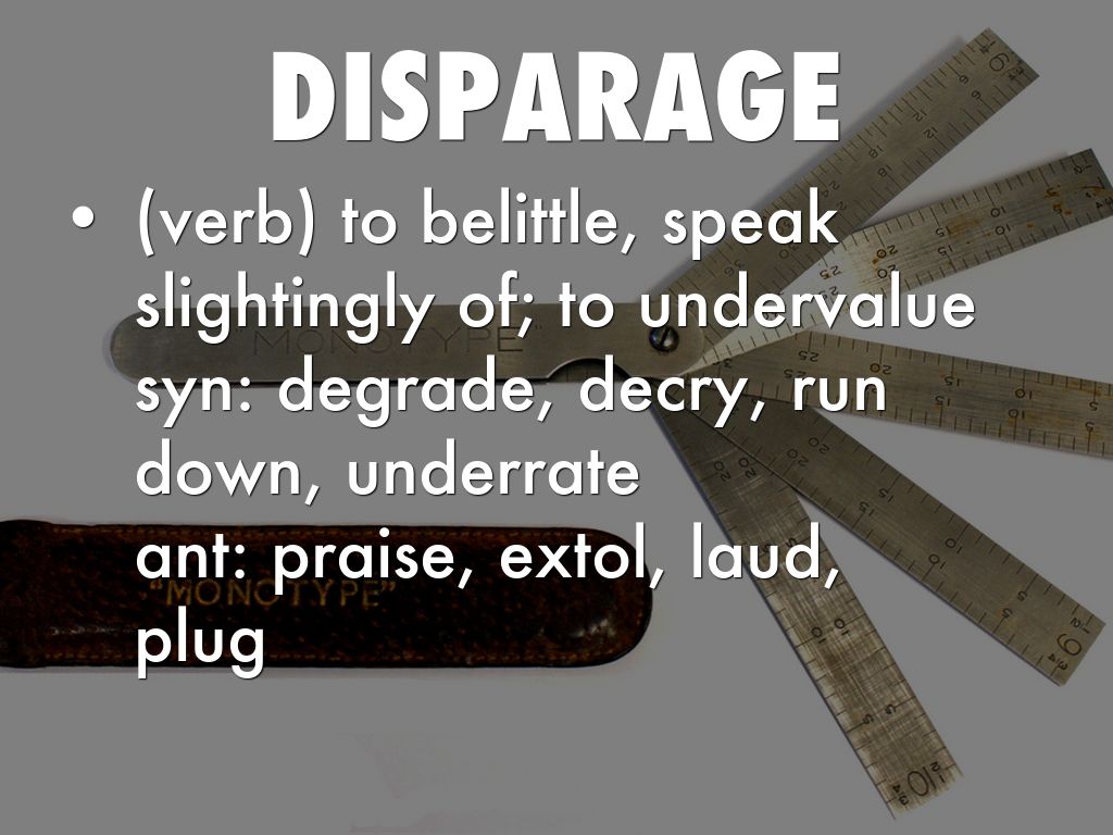 (verb) to belittle, speak slightingly of; to undervalue syn: degrade, decry, run down, underrate ant: praise, extol, laud, plug