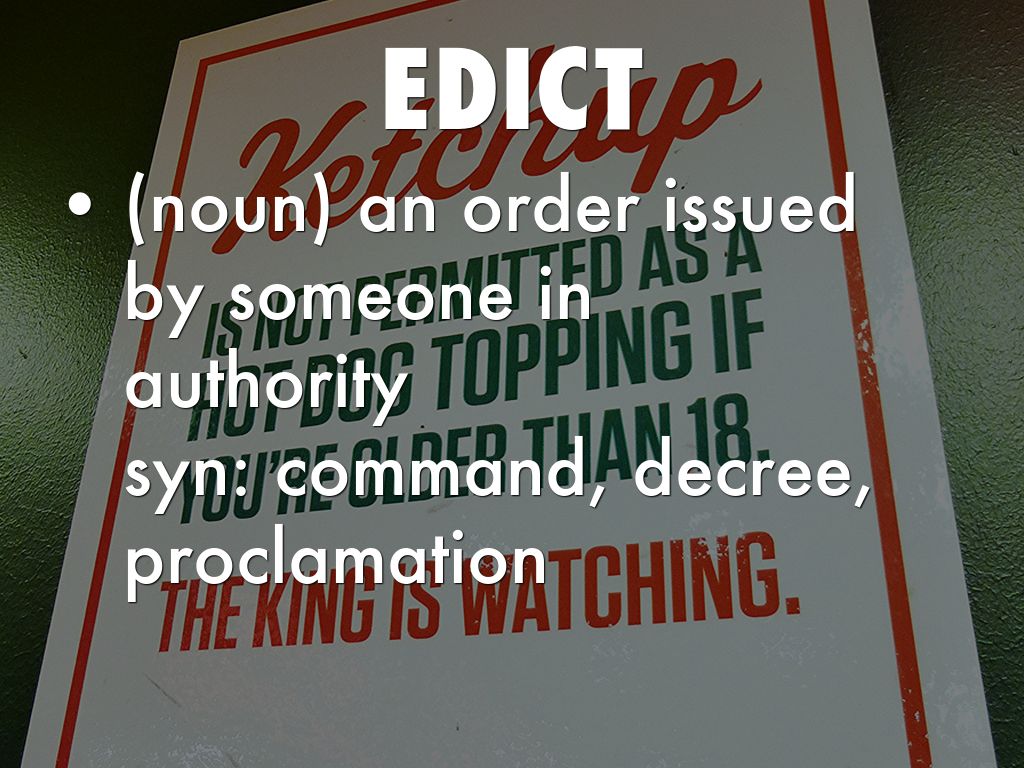 (noun) an order issued by someone in authority syn: command, decree, proclamation